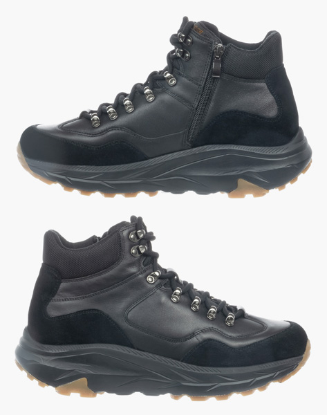 Верх из гладкой черной натуральной кожи в сочетании с вставками из нубука, текстильный манжет в области голеностопа - все детали создают актуальный продуманный образ. Застежка на молнии с внутренней стороны в дополнение к шнуровке значительно повышает удобство надевания. Текстильная подкладка обеспечивает комфортное тепло в прохладную погоду. Анатомическая стелька с выраженной поддержкой сводов способствует распределению нагрузки на ноги и снижению усталости при ходьбе. Голеностоп надежно удерживается от завала плотным задником. Модель очень легкая благодаря подошве из вспененного материала ЭВА,который еще и отлично амортизирует. а противоскользящий протектор обеспечивает устойчивость даже на скользких поверхностях. Подошва имеет перекатный профиль, что особенно полезно для людей, много времени проводящих на ногах. Такая подошва формирует физиологически правильную походку и снижает усталость.