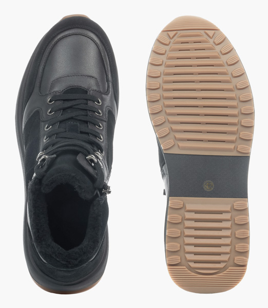 Верх из натуральной кожи черного цвета в сочетании с нубуком , дополненный черной массивной подошвой с каучуковым протектором - образец актуального стиля в сочетании с комфортом. Шерстяная подкладка и покрытие стельки обеспечат ногам тепло при минусовых температурах. Застежка на молнии с внутренней стороны в дополнение к шнуровке значительно повышает удобство надевания. Анатомическая стелька с выраженной поддержкой сводов способствует распределению нагрузки на ноги и снижению усталости при ходьбе. Голеностоп надежно удерживается от завала плотным задником. Модель достаточно легкая, благодаря подошве из вспененного материала ЭВА, который еще и отлично амортизирует, а противоскользящий протектор обеспечивает устойчивость даже на скользких поверхностях. Подошва имеет перекатный профиль, что значительно снижает усталость при длительной ходьбе и благоприятно влияет на здоровье суставов и позвоночника.